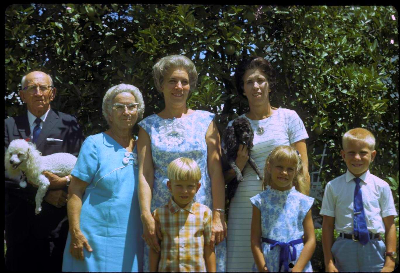 From top left to right: Cloyd Kuster (6/25/1898 - ?) , Beulah Warnets Kuster (9/05/1899 - ?), Mary Kuster Peters, Jean Kuster Ott and The three kids are David, Caroline and Richard. This picture was taken October 1970 in St. Petersburg, Florida. |